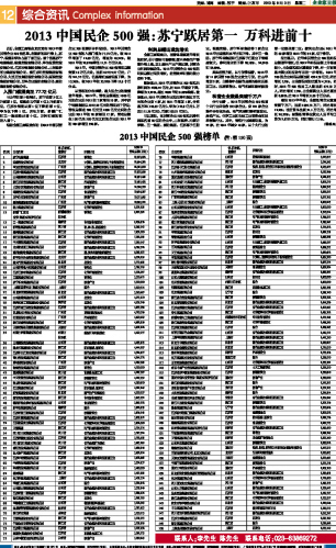 2013中国民企500强:苏宁跃居第一 万科进前十...