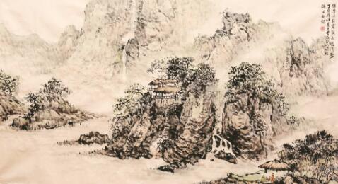 曾石老师又是一副青绿山水,磅礴气势中有草屋、山泉一派生机盎然……