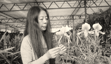 ●帕奈博士的遗孀干文清在查看兰花发育状况。
