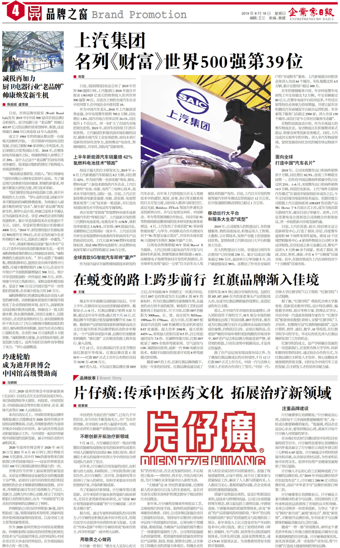 上汽集团 名列《财富》世界500强第39位...
