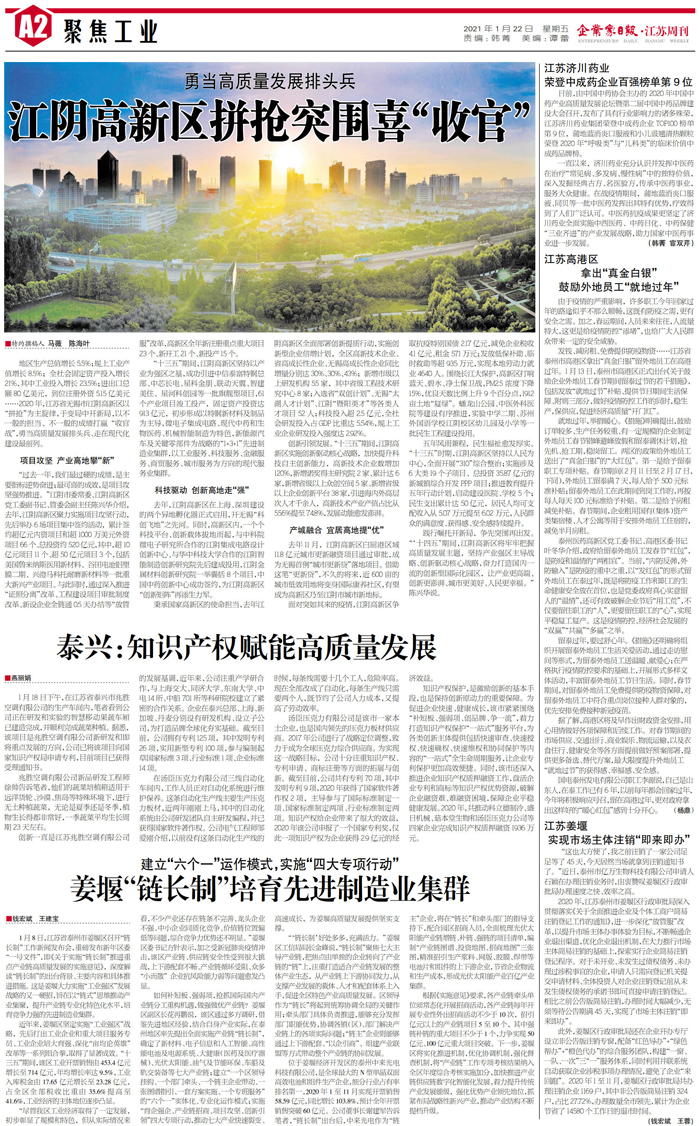 勇当高质量发展排头兵 江阴高新区拼抢突围喜“...