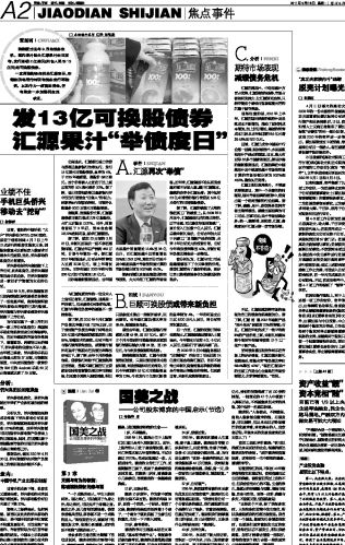 发13亿可换股债券 汇源果汁“举债度日”...
