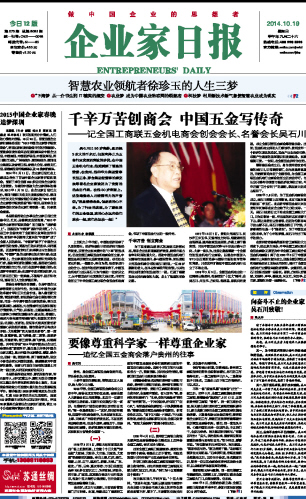 读了本报今日头版头条记全国工商联五金机电商会名誉会长吴石川的新闻, 深受感动。吴石川的奋斗经历书写了一个中国企业家的传奇,他的奋斗不已的精神令人钦佩。