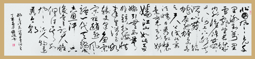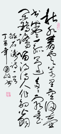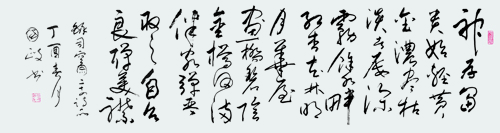 纵观张先生的作品,跌宕中有收留,纵横驰骋之中有沉着宁静,线条刚劲而连绵,放笔纵横体势灵动,有方圆流峙经纬昭回之仪态,有纵横奔放,浩荡奋起之灵感。书法直取自然,万象入书,大气磅礴,匠心独具,其作品大开大合,而不失肃穆文雅,潇洒飘逸,而不失浑厚稳重,痛快淋漓,而不失规矩法度,实可谓动中寓静,以静制动,静以动美,动因静生,妙趣无穷。苍劲有力,气度非凡,美不胜收。有滚滚风云一泻千里之势,自成一体。真可谓难得。