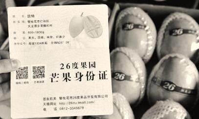 网上营销思路带来了经济效益,今年7月,他们最高日销量在3000件以上,在全国网销芒果中名列前茅。为了显示芒果的高品质,这里诞生了中国第一张“芒果身份证”,扫码每箱芒果中的“身份证”,可以知道芒果的姓名、体重、特征,出生地(村)的海拔、纬度。