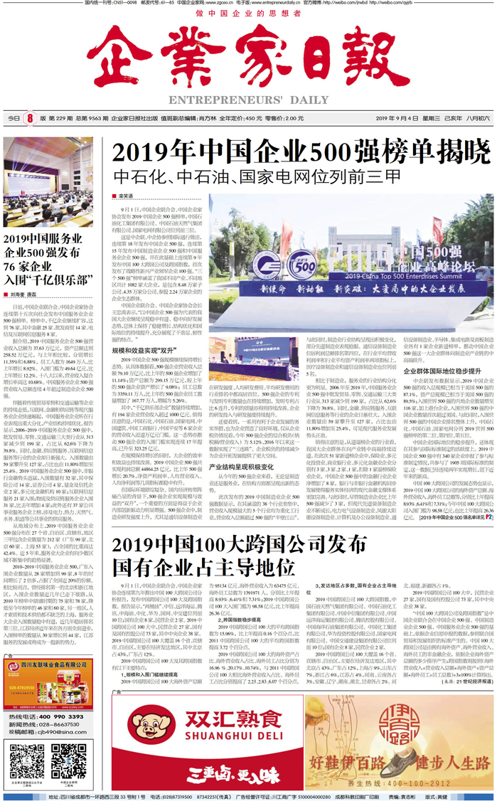 2019中国服务业 企业500强发布 76家企业 入围“...