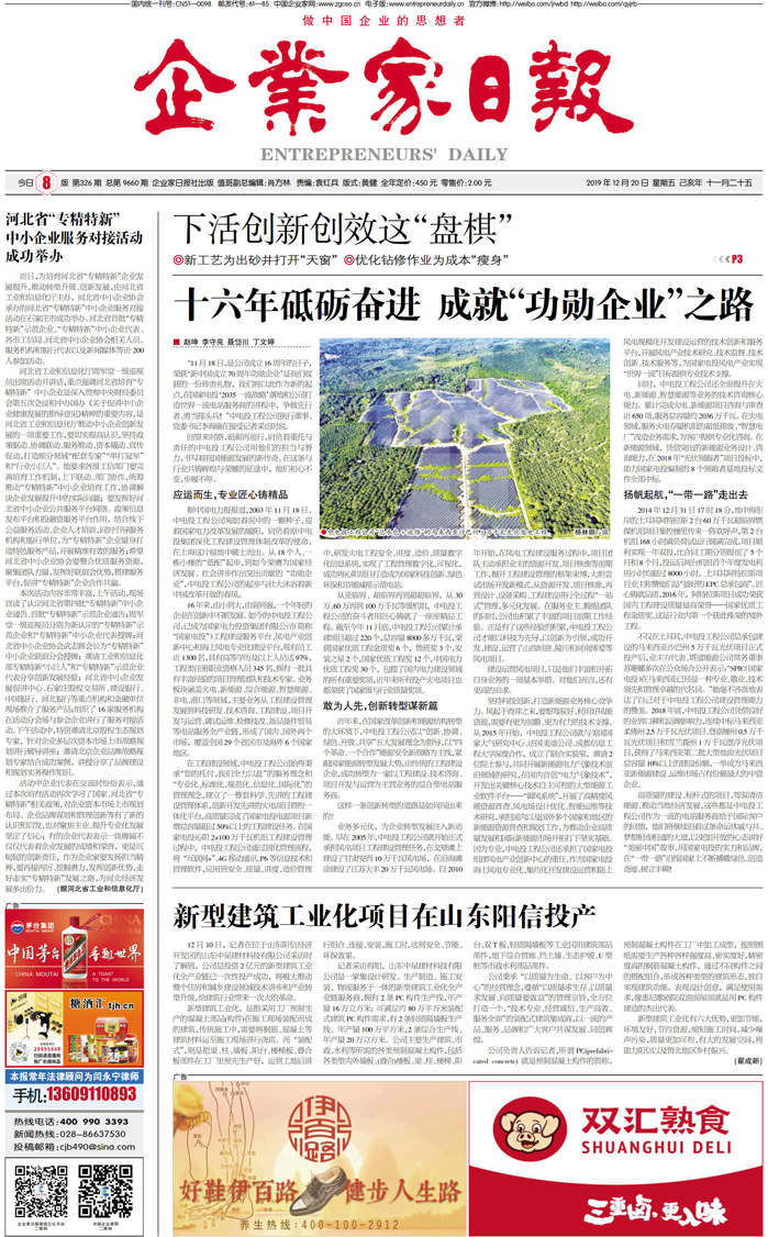 “11月18日,是公司成立16周年的日子,荣获‘新中国成立70周年功勋企业’是我们收获的一份珍贵礼物,我们将以此作为新的起点,在国家电投‘2035一流战略’落地和公司打造世界一流电站服务商的进程中,争做先行者、勇当排头兵!”中电投工程公司执行董事、党委书记李海瑜在接受记者采访时说。