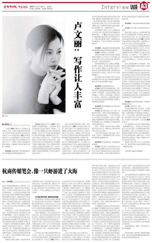 卢文丽:我长期在媒体工作,写作一直属于业余爱好。我参与过两张报纸的创办,经历了报业鼎盛与滑坡。三十多年来,我走过了许多路,见识过各种人,生活之丰富性也赐予我强韧的耐心和较为通达的世界观。经历即财富,每一步都算数,生活阅历是文学创作的源头活水。