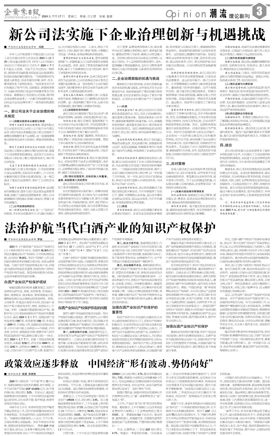 中华人民共和国第十四届全国人民代表大会常务委员会第七次会议在2023年12月29日审议通过新修订的《中华人民共和国公司法》(以下简称新《公司法》)于2024年7月1日起正式实施。习近平总书记指出:“现阶段,我国经济发展的基本特征就是由高速增长阶段转向高质量发展阶段。”当前我国经济发展进入新常态,经济发展的环境、条件、任务、要求都发生了深刻的变化,①这些变化对企业治理提出了转型升级、创新驱动、质量效率提升、完善治理结构以及适应市场需求等全方位的要求。随着新《公司法》的正式实施,我国的企业治理体系迎来了一次重大的制度性变革,同时也为企业治理带来了一系列新的机遇和挑战。