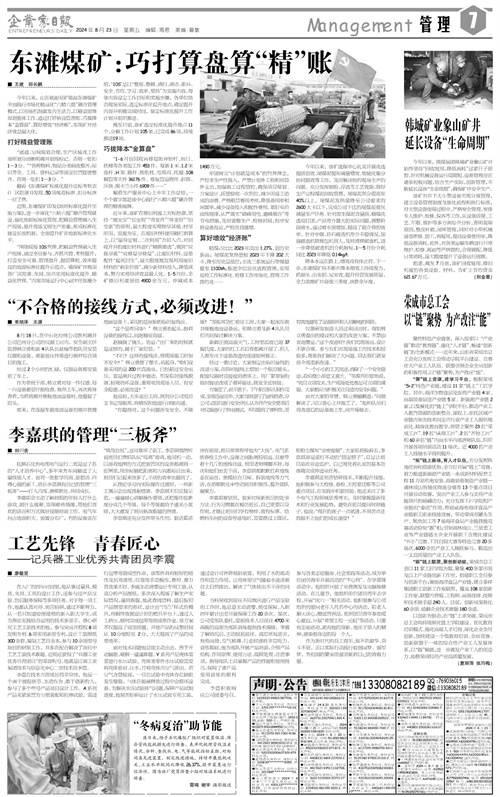 精煤占比比2023年高出1.27%,创历史新高;尾煤泥发热量较2023年下降202大卡,降至历史最低位;主洗三系统运行带煤量提至1100t/h;推进全信息化流程管理,实现巡检工作标准化、检修工作市场化、管理工作简约化……
