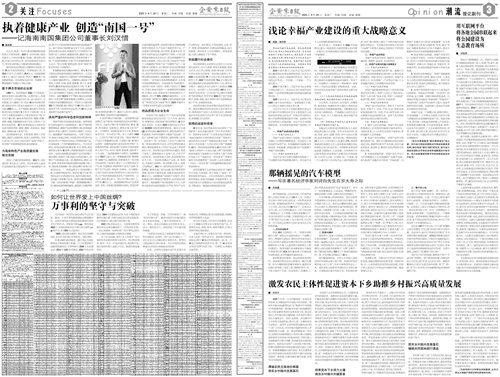 企业经营模式不断创新。一是创新特色食品模式。这个板块以海南南国食品实业有限公司为主。主要生产椰子系列固体饮料、糖果、咖啡、休闲食品、果蔬制品、调味品6大系列产品。公司拥有厂房面积超2万平方米,配备多条全自动、半自动生产线,员工人数约1000人。公司年生产能力达2万吨。“南国”牌系列产品以天然健康的品质、上佳的口感、精美的包装和一流服务赢得社会各界的好评和广大消费者的青睐。南国品牌产品销往全国各地和线上各大平台,并出口美国、新加坡、迪拜等十几个国家。二是创新健康产业模式。南国健康公司2012年创立,是一家集健康科技、健康教育、健康产品、健康体验、旅游观光为一体的现代化高科技工业园区,建立了十万级的净化生产车间,引进德国、韩国营养产品生产设备,实现了生产自动化、智能化、标准化。并与德国、日本以及国内多家营养研究中心进行技术合作,生产技术荣获国家多项生产发明专利。公司投入资金3亿多元,预计年产能万吨以上,年产值20亿以上。南国健康的营养产品选用绿色、有机、非转基因的植物为原料,采用世界先进的超低温萃取、亚临界冷榨及生物抑制醛类等专利技术,生产出冻干果蔬营养产品。产品适用于营养配餐、医疗营养、素食养生等,同时可为营养食品企业提供生产原料。公司已获得国家高新技术企业认证,成为海南健康产业标准示范基地。今后公司主攻方向是生产有利于人体健康的“特医产品”“功能性产品”。三是创新农文旅模式。这个板块以定安南国旅游健康文化传播有限公司为主。主要经营的项目有:具有印尼特色的国家3A级旅游景区—兴隆巴厘村旅游景区、南国健康产业园中旅游文化板块、三亚华庭生活旅游购物超市、大东海生活旅游购物超市。四是创新电子商务模式。南国电子商务(海南)有限公司成立于2010年,专业从事电子商务——网络销售和直播销售,在淘宝、京东、拼多多等大型网站都开办了旗舰店,并以年50%~100%的速度增长。公司先后荣获“阿里巴巴2014年度伙拼最佳先锋奖”“阿里巴巴实力商家”称号,2015年被评为“全国农业农村信息化示范基地”。