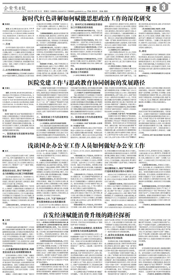 国企办公室是国有企业的“中枢”,发挥着上传下达、内外沟通的重要作用,其工作具有鲜明的政治性、示范性、综合性和服务性。在新形势下,国企办公室工作人员要努力做好办公室各项工作,不断提升“三办”“三服务”质效,助推企业高质量发展。