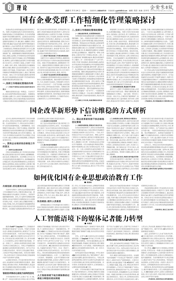 近年来,我国经济体制改革工作在持续推进与优化,国有企业改革进入新阶段与关键时期。在这样的形势之下,国有企业信访维稳工作与经济改革紧密相连,二者相辅相成。信访维稳不仅能从源头上维护企业稳定,更是积极保障国有企业经济改革顺利进行的关键屏障,为改革筑牢稳定根基,助力改革行稳致远。基于此,针对国有企业新形势下信访维稳工作进行分析,提出合理的信访维稳策略,以期起到参考的作用。