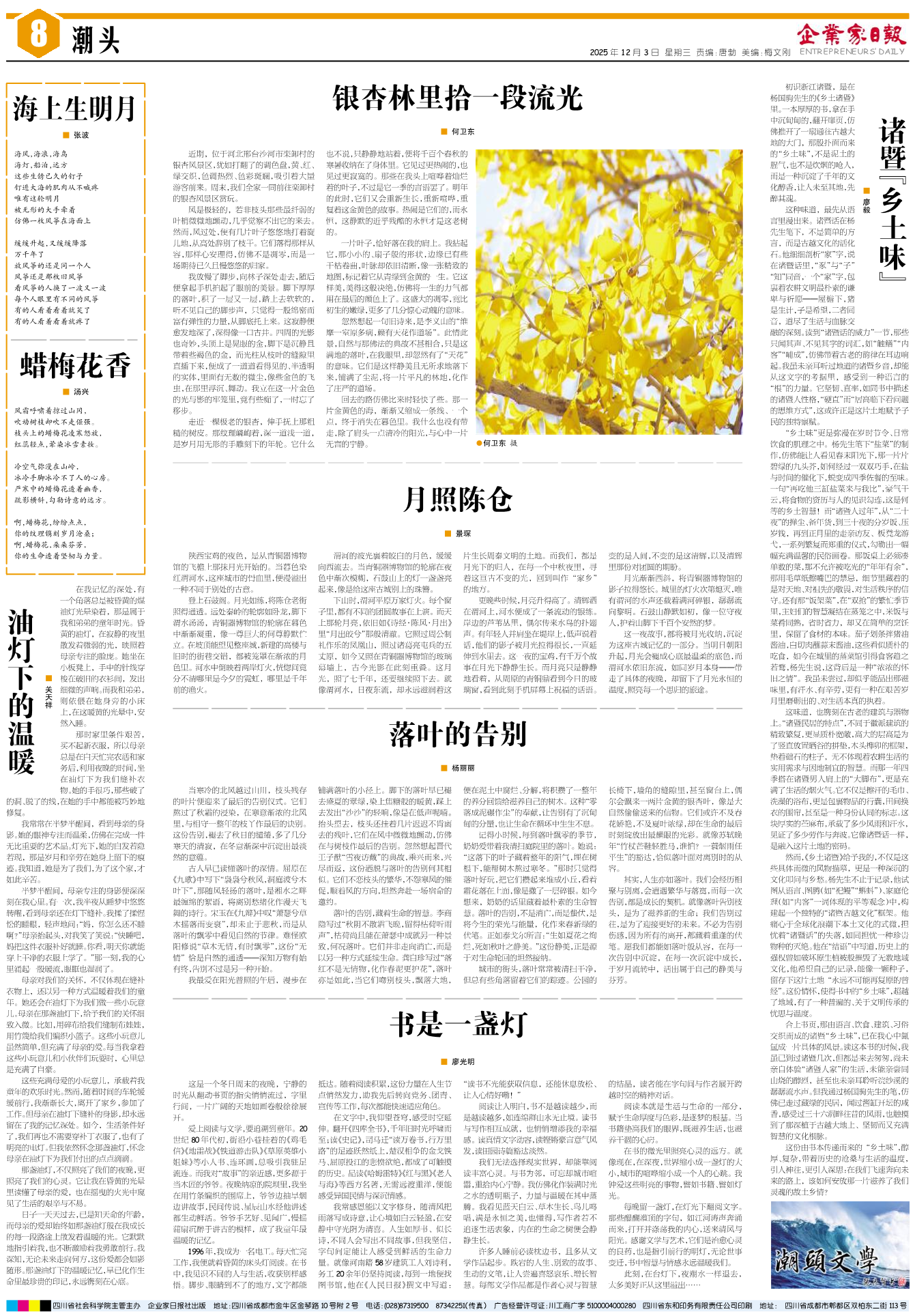 然而,《乡土诸暨》给予我的,不仅是这些具体而微的风物描摹,更是一种深沉的文化叩问与乡愁。杨先生不止于记录,他试图从语言、图腾(如“祀鳗”“蝌蚪”)、家庭伦理(如“内客”一词体现的平等观念)中,构建起一个独特的“诸暨古越文化”框架。他痛心于全球化浪潮下本土文化的式微,担忧着“诸暨话”的失落,如同担忧一种珍贵物种的灭绝。他在“结语”中写道,历史上的强权曾如破坏原生植被般摧毁了无数地域文化,他希望自己的记录,能像一颗种子,留存下这片土地“永远不可能再复原的曾经”。这份情怀,使得书中的“乡土味”,超越了地域,有了一种普遍的、关于文明传承的忧思与温度。