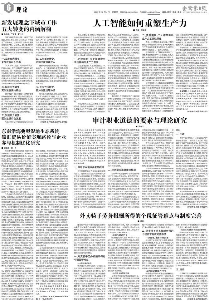 外卖骑手劳务报酬的个税征管,是数字经济时代税收治理适配新就业形态的重要课题,关系到税收公平、财政收入与灵活就业群体权益。通过明确计税标准、构建数字化监管体系、强化平台责任与分类征管,既能有效防范税收流失,又能保障骑手合法税收权益,推动新就业形态税收治理体系和治理能力现代化,为数字经济的高质量发展提供坚实法治保障,也为其他新就业形态的个税征管提供可借鉴的思路。(作者单位:贵州财经大学)